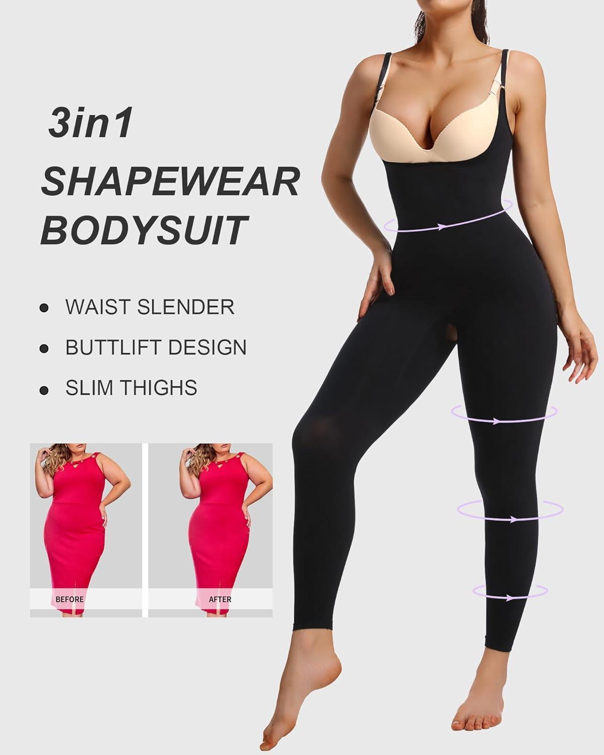 SHAPERX Hourglass Leggings 360 Compression 2 Sizes Look Full Body Shaper Breathable No Roll Down(Black (Open Bust))