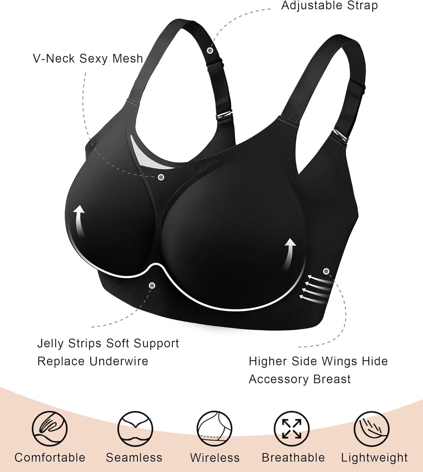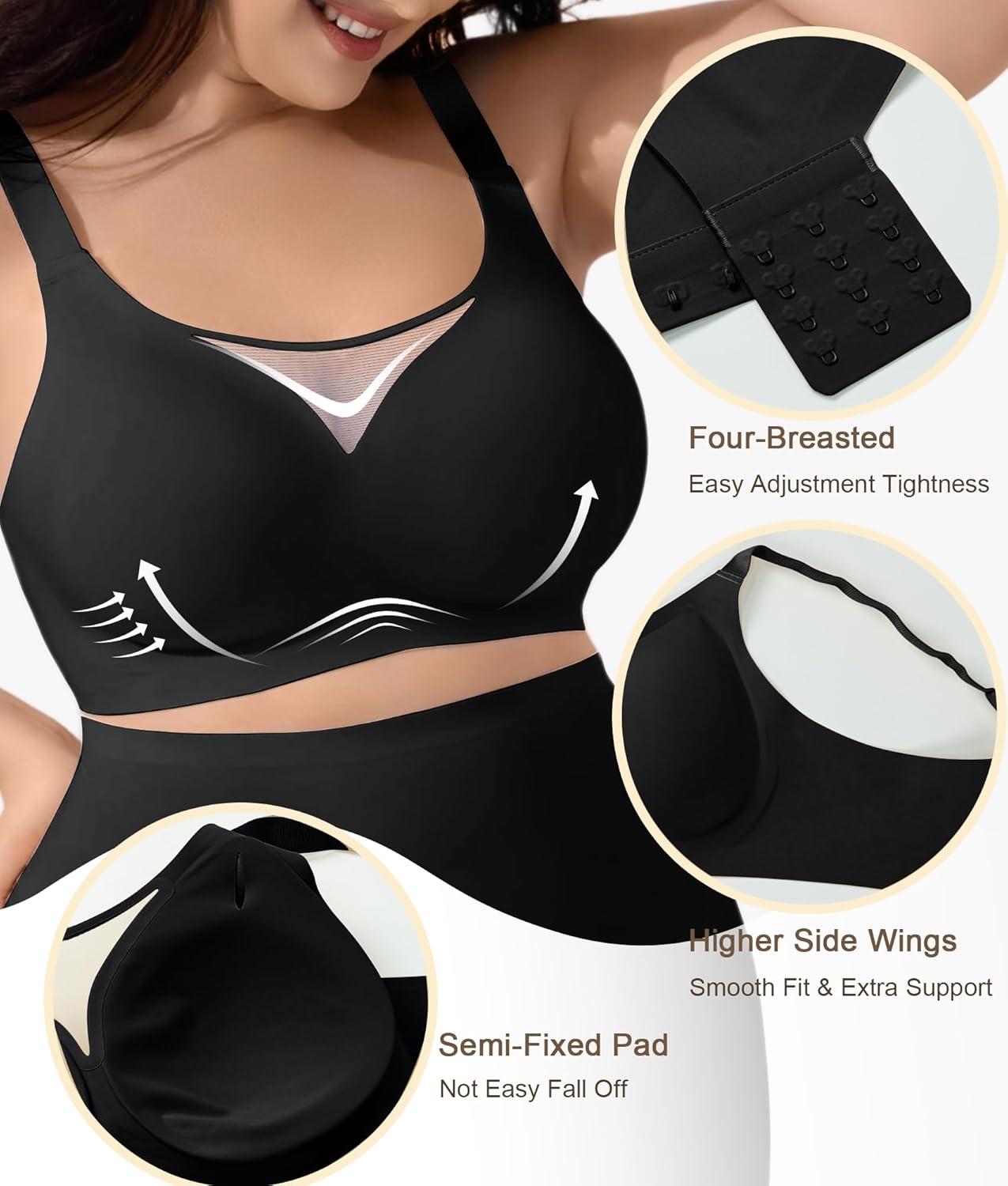 SHAPERX Wireless Bras for Women Seamless Push Up V Mesh Bralette No Underwire Full Coverage T-Shirt Bra with Removable Pads(1-black)