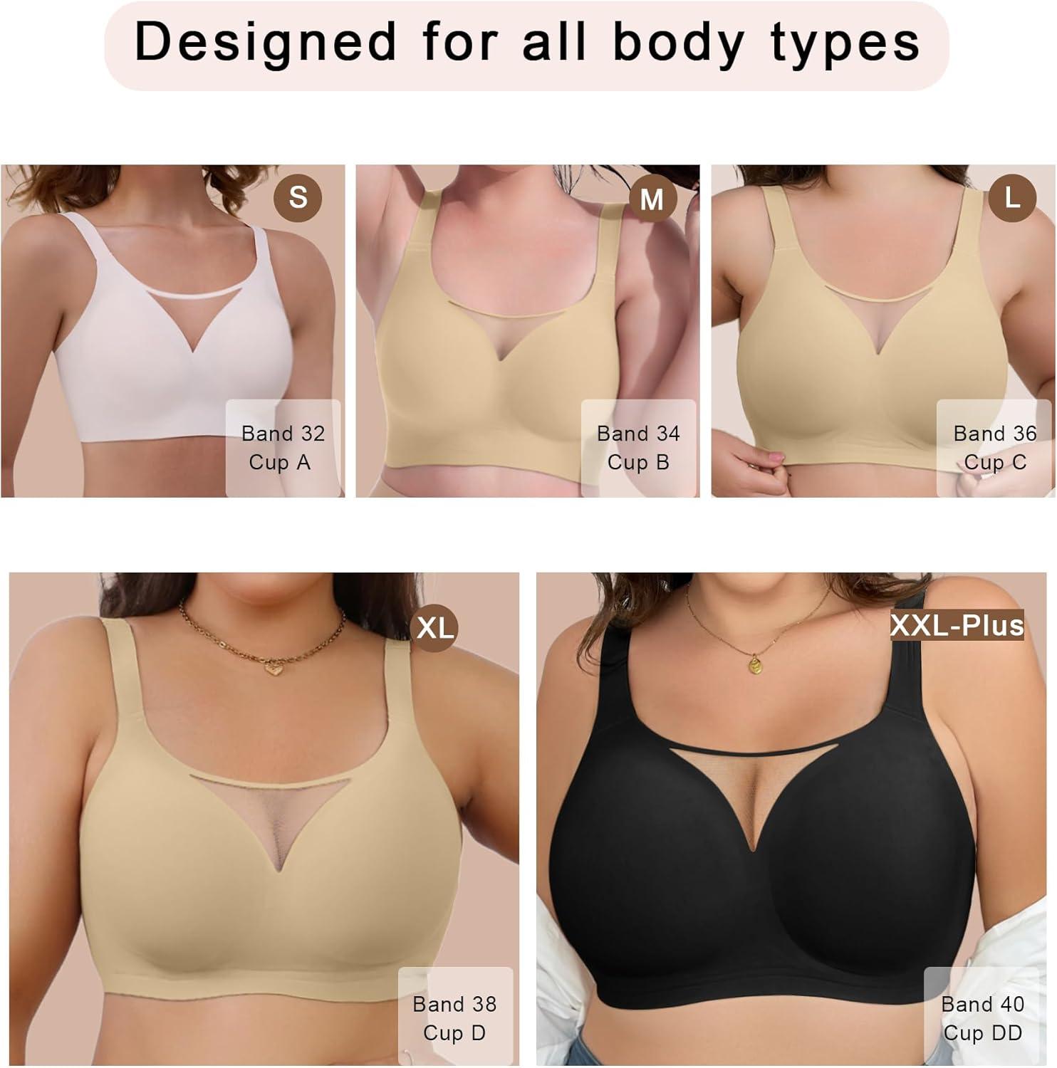 SHAPERX Wireless Bras for Women Seamless Push Up V Mesh Bralette No Underwire Full Coverage T-Shirt Bra with Removable Pads(1-beige)