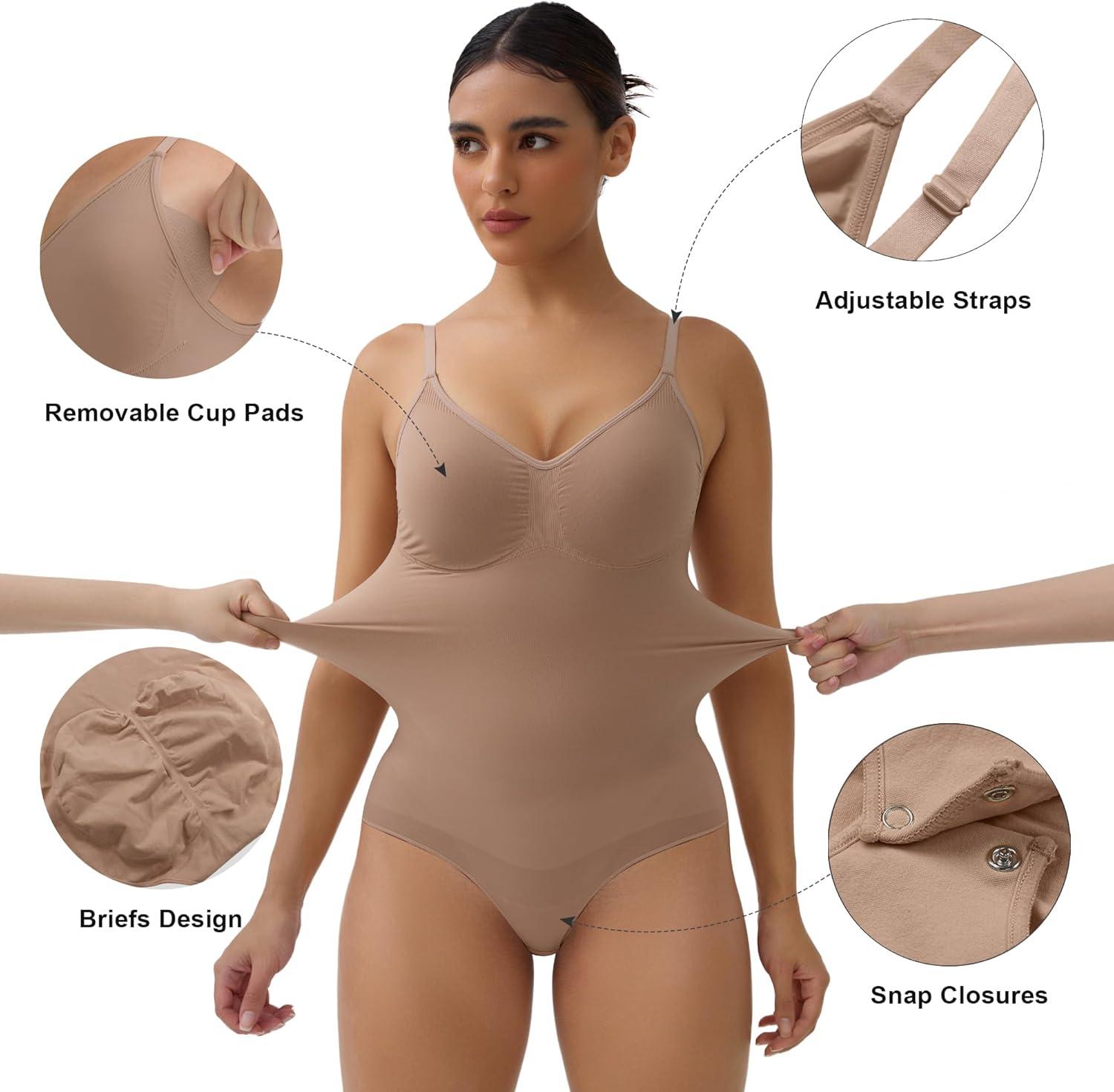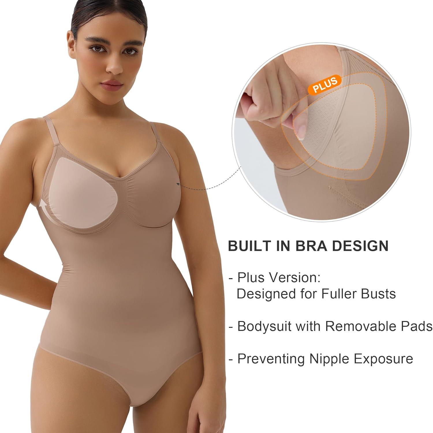 SHAPERX Women’s Shapewear Tummy Control Bodysuit with Removable Pads Seamless Sculpting Mid Thigh Body Shaper(Beige (Thong))