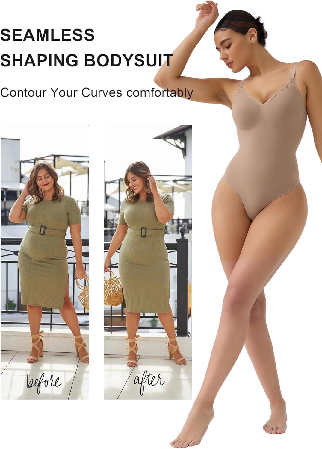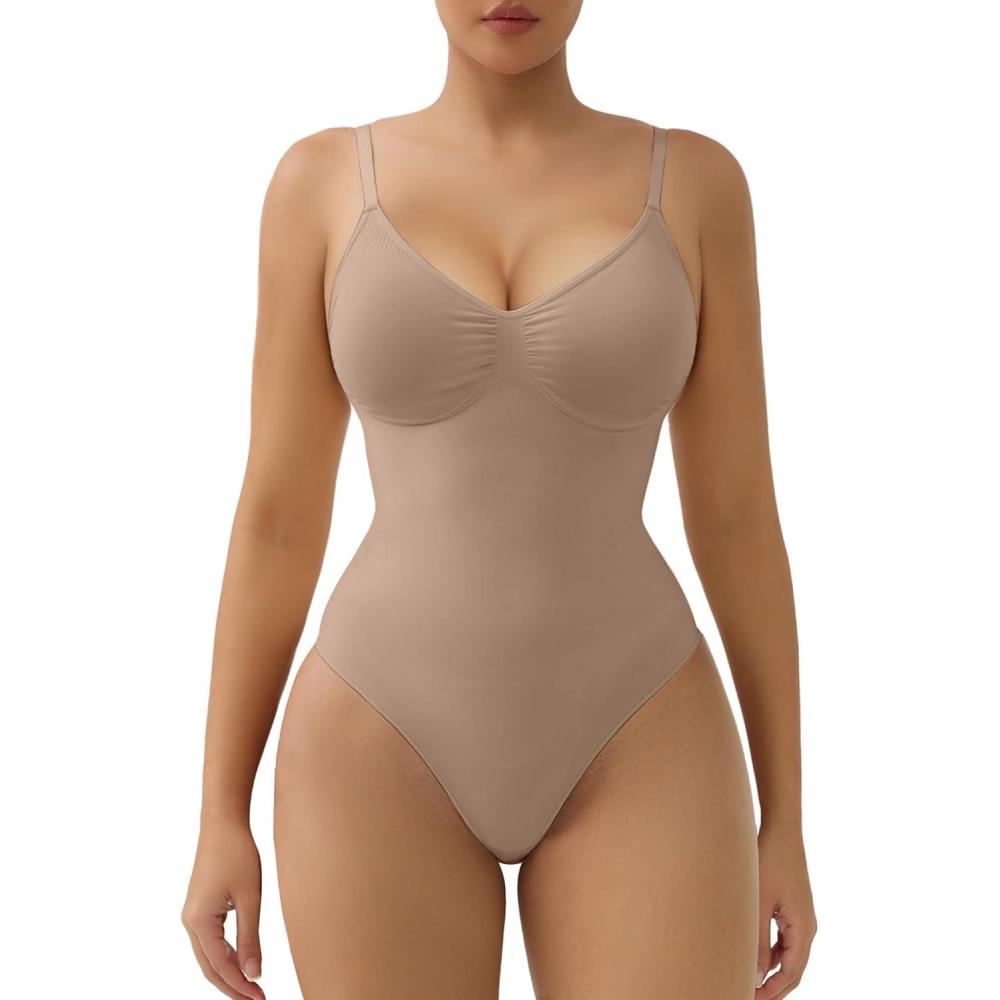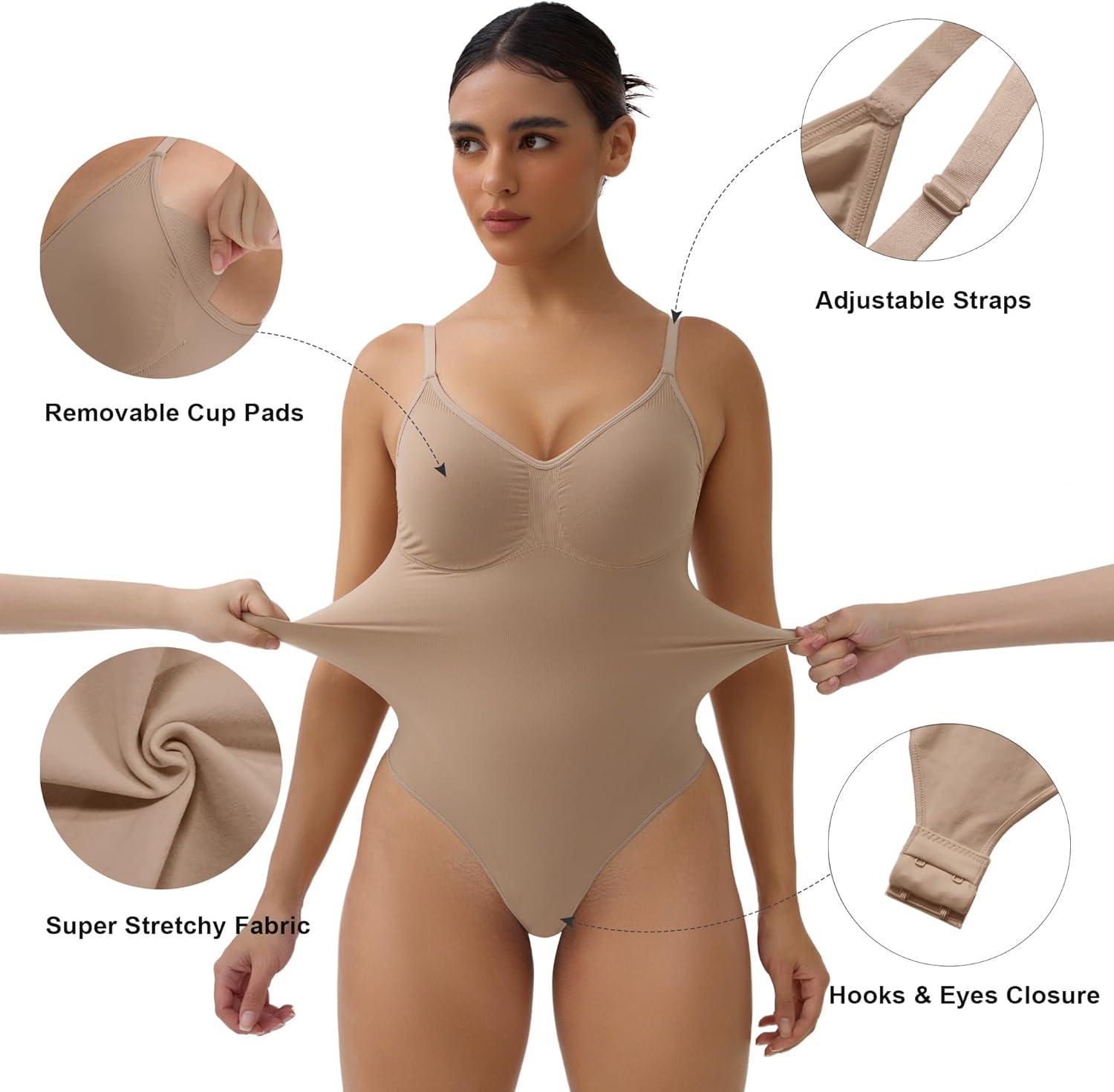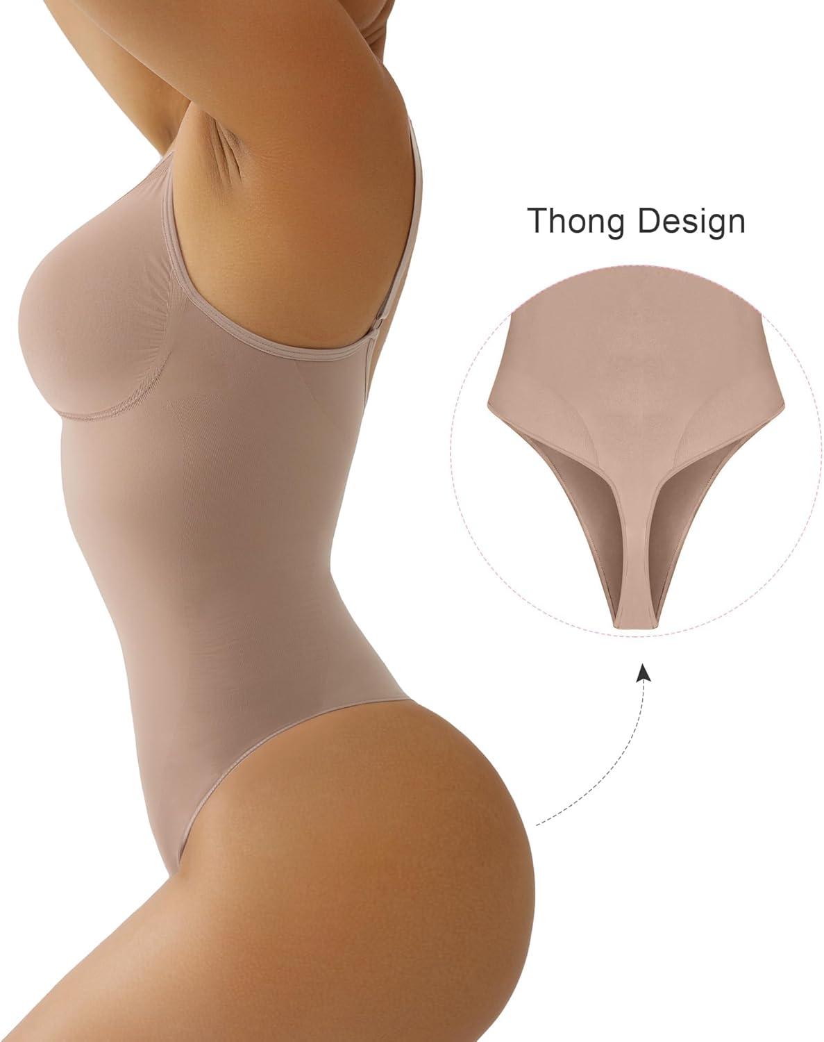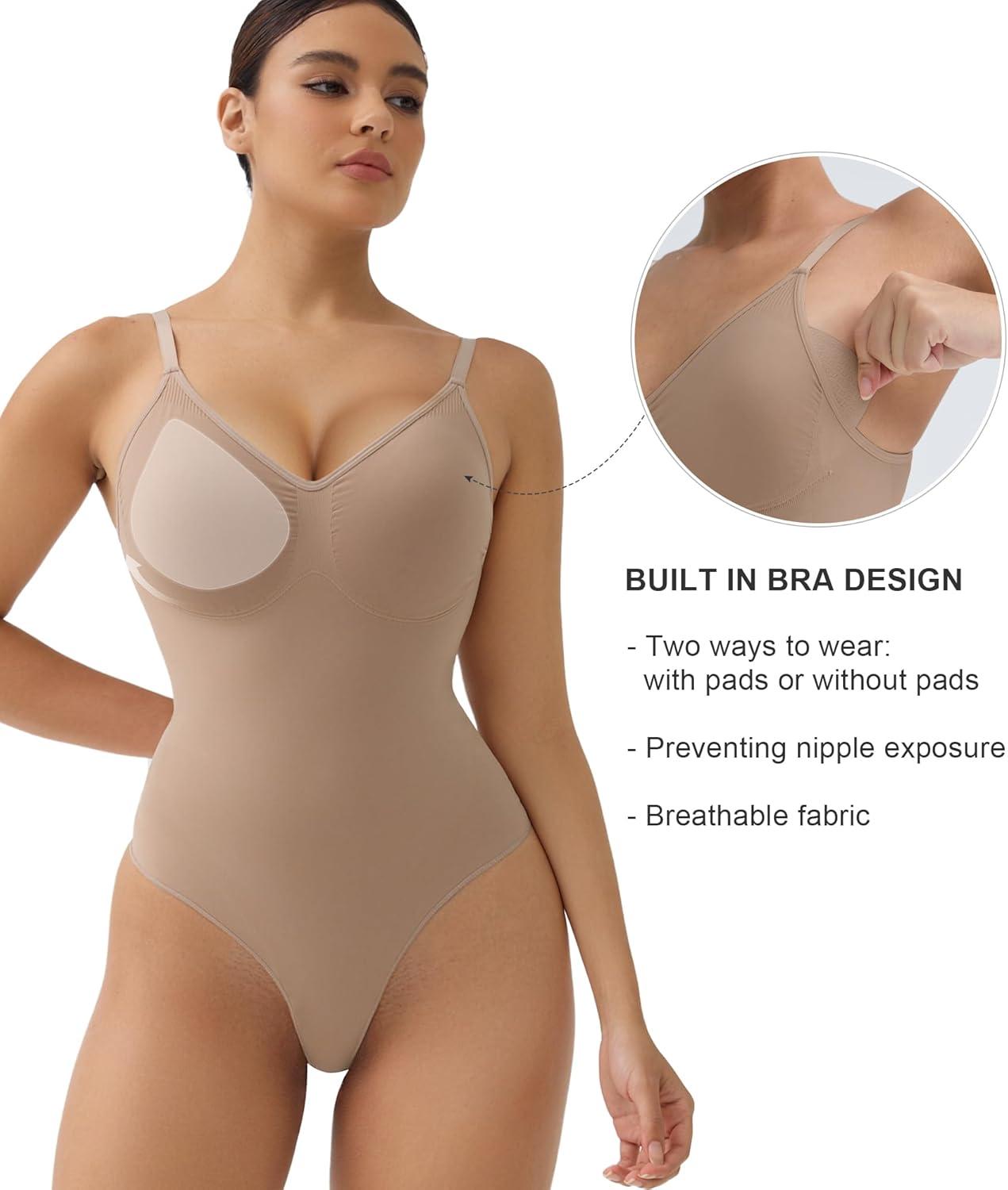 SHAPERX Women’s Shapewear Tummy Control Bodysuit with Removable Pads Seamless Sculpting Mid Thigh Body Shaper(Sienna (Thong))